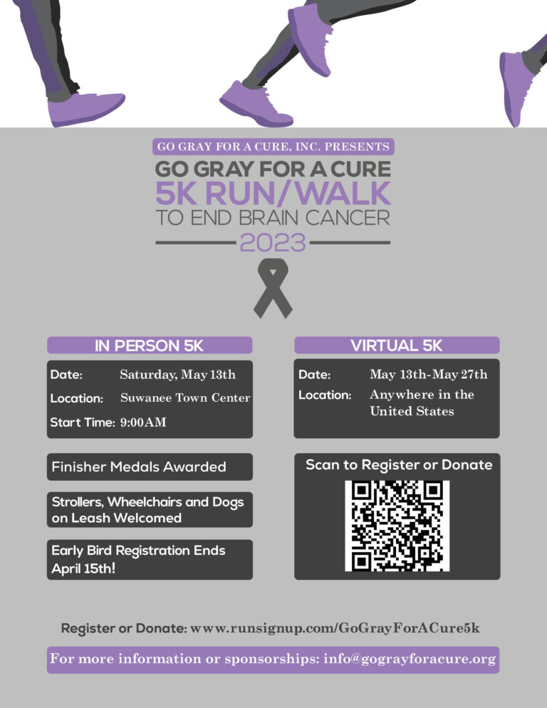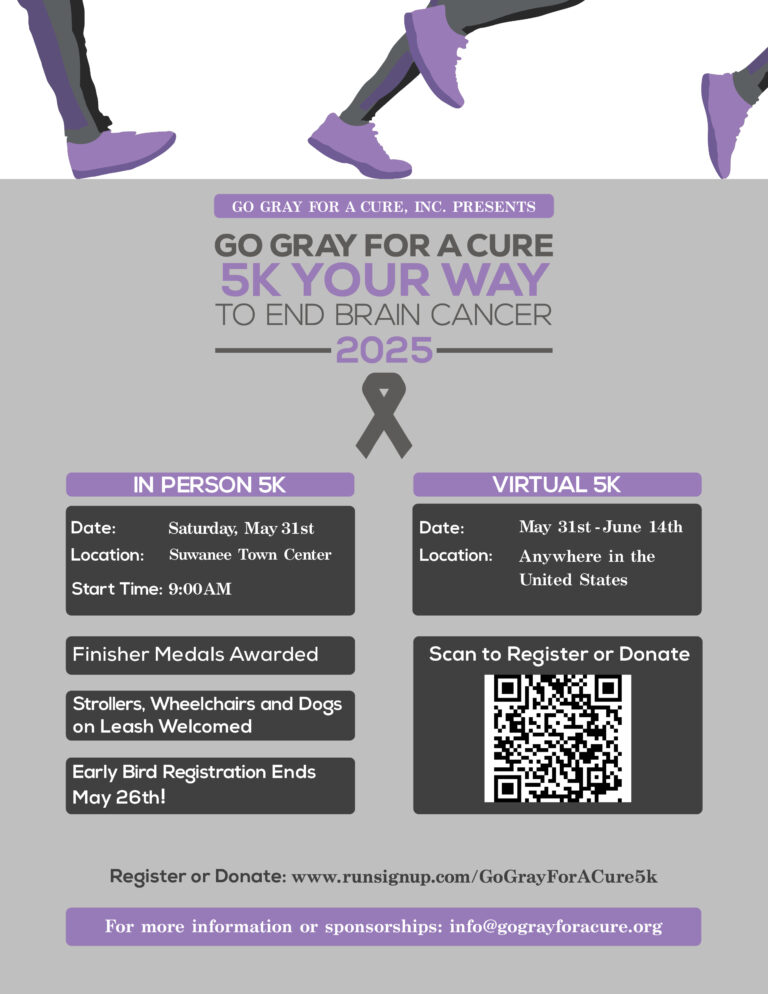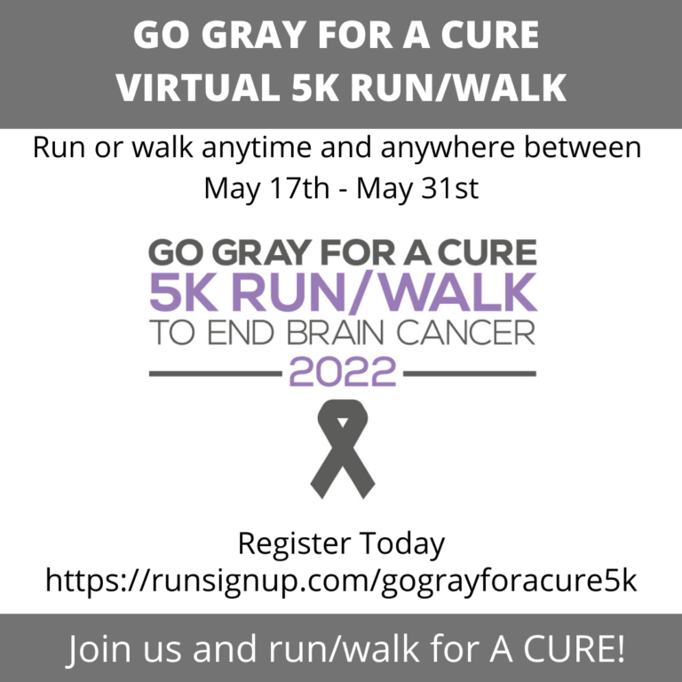 May is Brain Cancer & Brain Tumor Awareness Month. We are doing our Virtual 5K Run/Walk to raise awareness and money for life-saving brain cancer research. Join us in the fight against brain cancer by signing up for our run/walk today. This is a virtual event from May 17th – May 31st, so you can run or walk anytime and anywhere within these dates. Sign up today and run or walk with us for a CURE! We must find a CURE!
